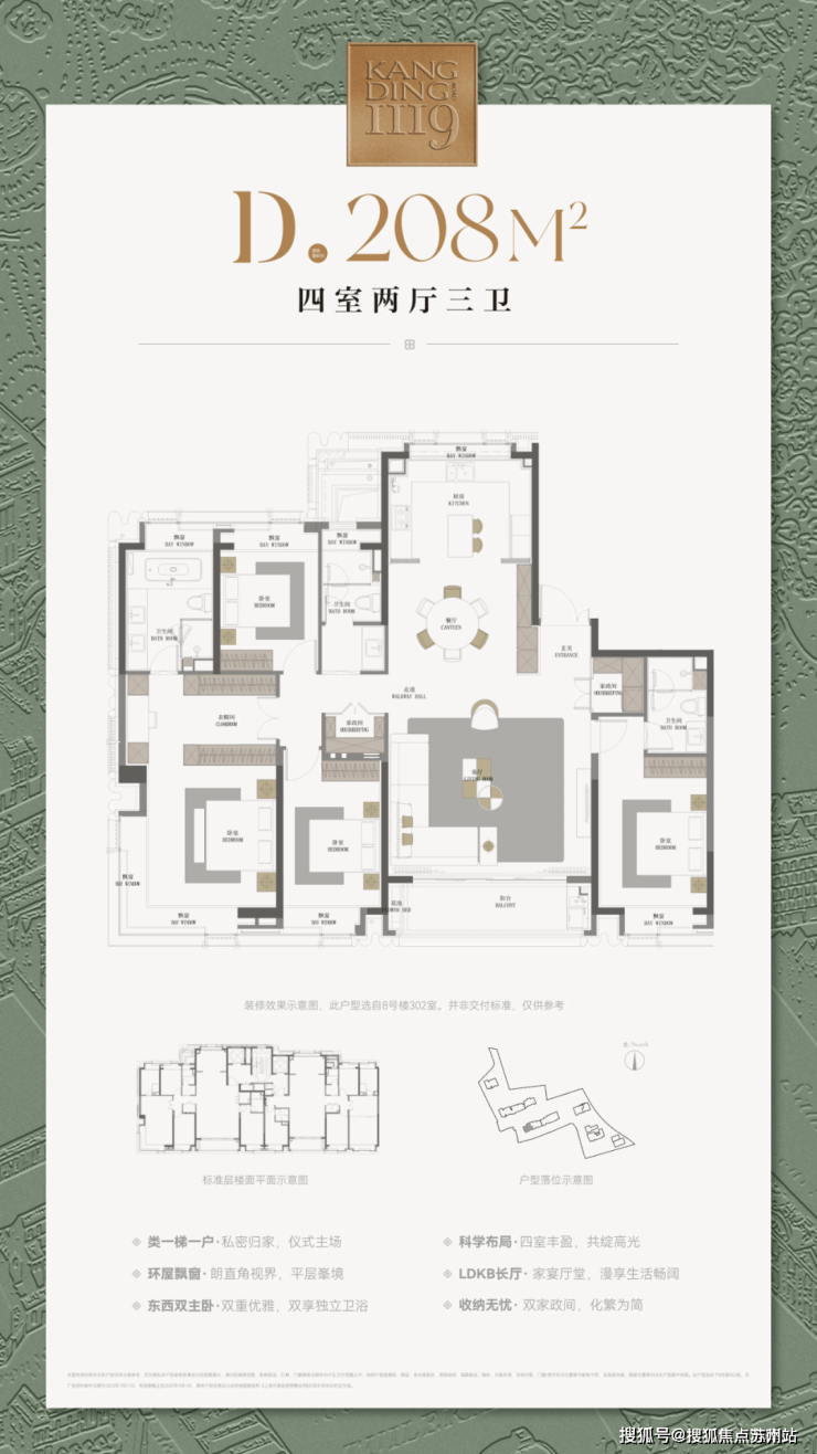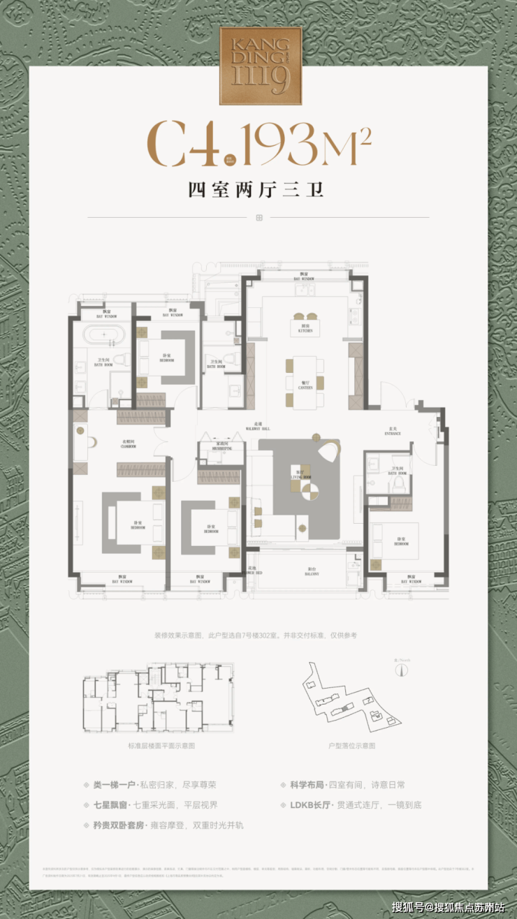 以建面约193户型为例,卫浴设备是采用国际大品牌如唯宝、高仪、卡德维等,厨电品牌采用嘉格纳,全套配置油烟机、灶台、洗碗机、双开门冰箱、蒸烤一体机等,同时装配德国美诺洗衣机烘干机套装。