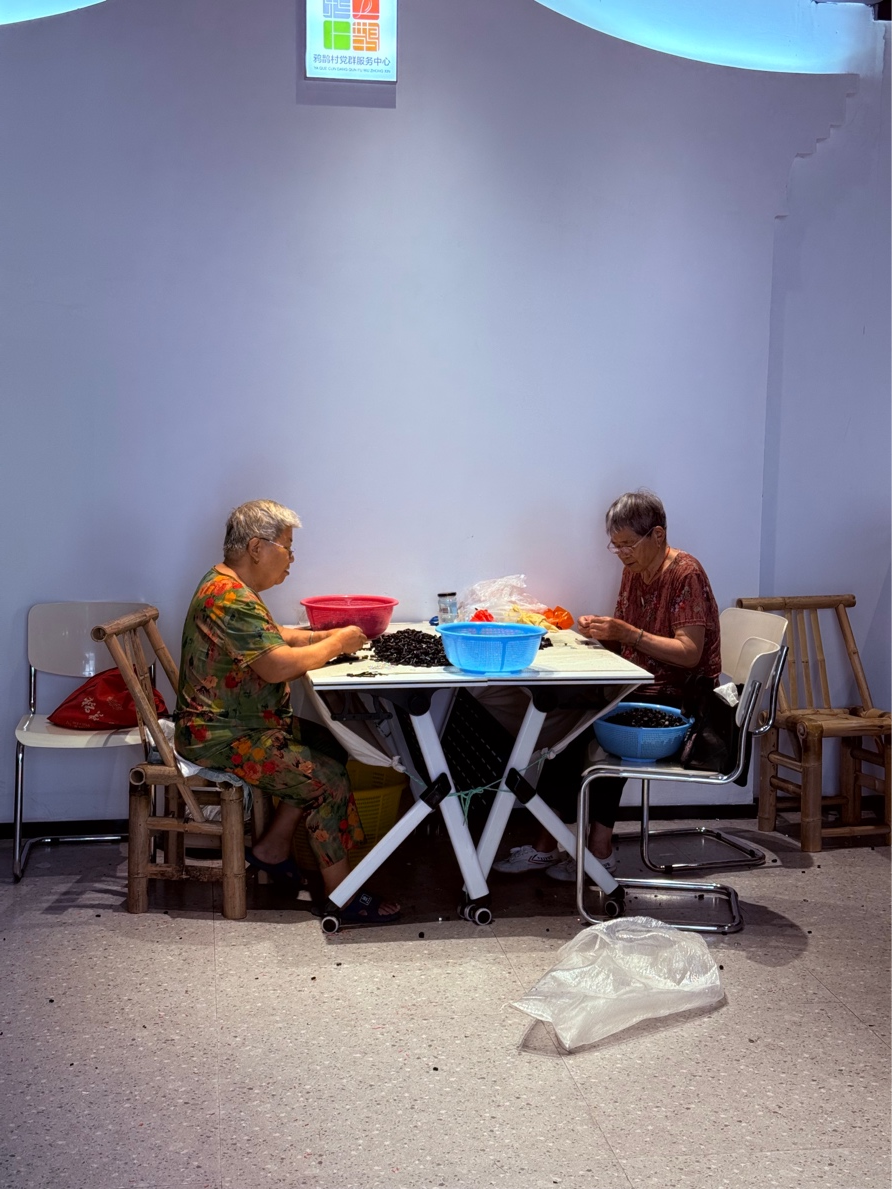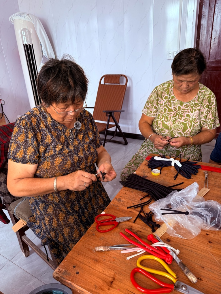 早上8点刚过,浙江嘉善西塘镇鸦鹊村的“6070连心扣”共富工坊里已经热闹起来。