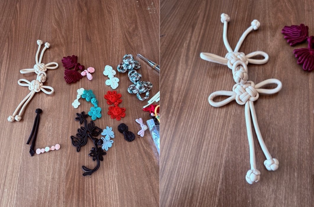 杨立华表示:“第一道是‘选料’,一般都会采用棉布、绸缎布等各种花样,按照每个客户需要来定。第二道是‘落料’,选好的面料把线弄好。第三道是把剪好的条子在缝纫机上缝成扁圆形的布条。把布条对折,中间打一个葡萄结,做成大小圆圈。”